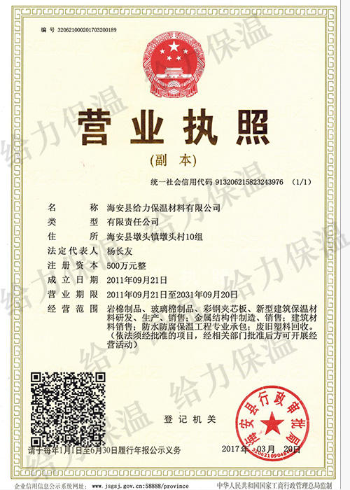 海安縣給力保溫材料有限公司(原海安縣創業保溫材料廠)成立于1990年。公司位于江蘇省南通市海安縣墩頭鎮,占地面積20畝,建筑面積12000㎡。